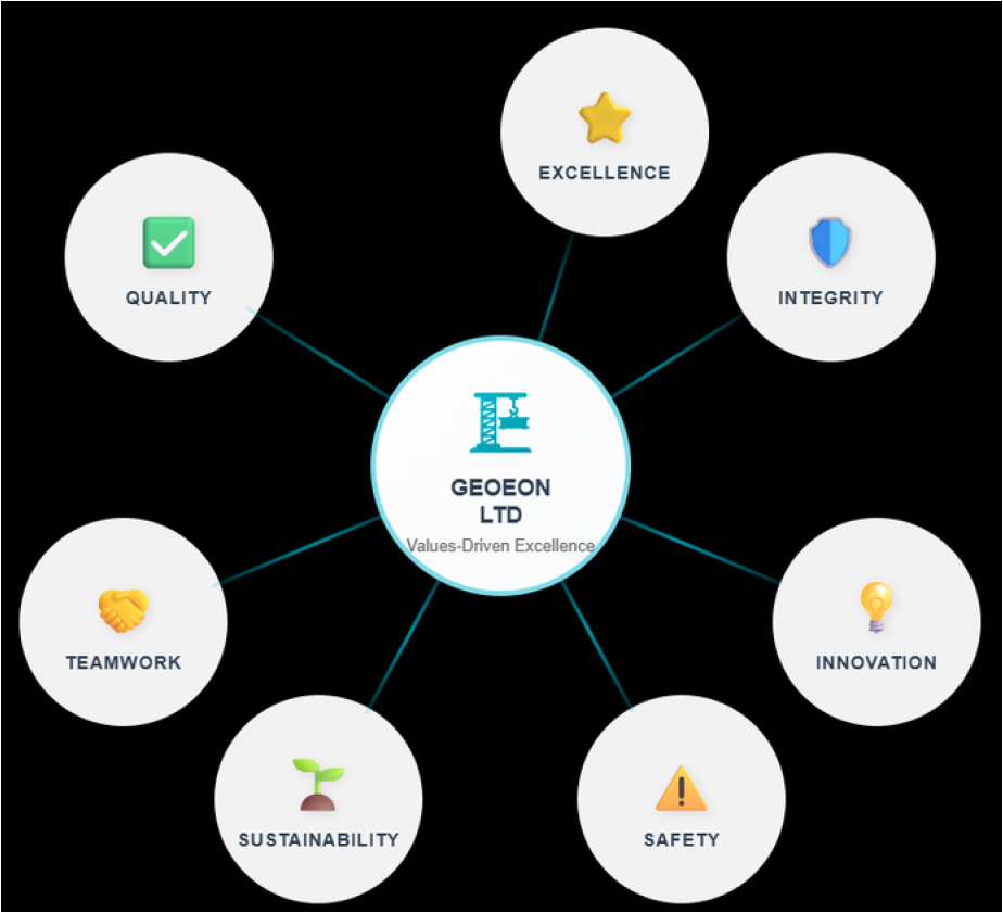 Our core values at Geoeon Ltd are interconnected, with each principle supporting the others. Excellence fuels Innovation and
